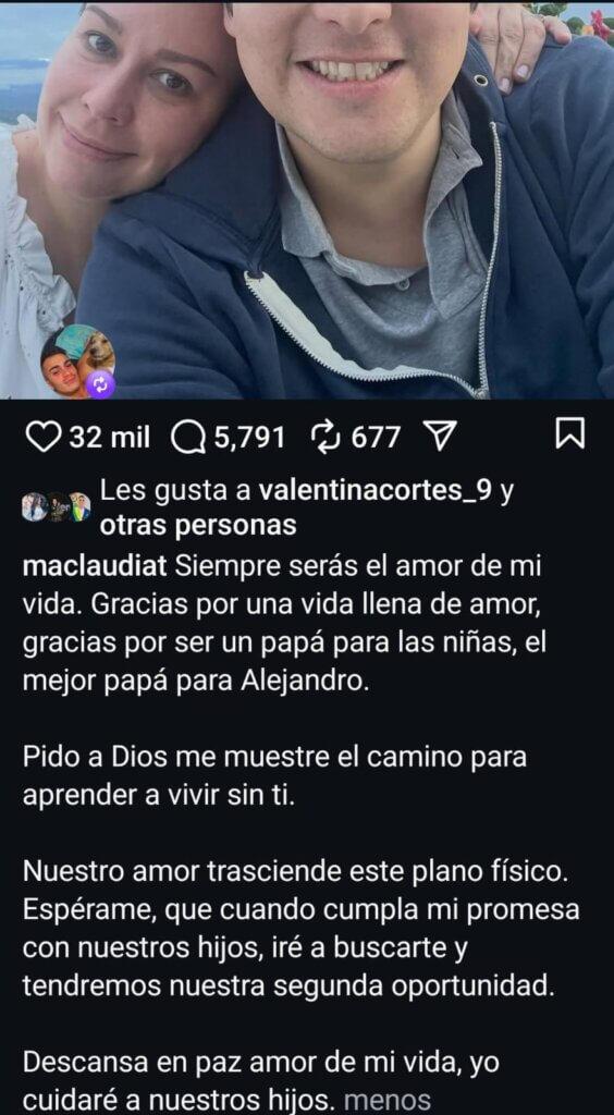 La noticia fue confirmada por su esposa, María Claudia Tarazona, quien a través de un emotivo mensaje en sus redes sociales, expresó su dolor y prometió cuidar a sus hijos. "Descansa en paz amor de mi vida, yo cuidaré a nuestros hijos", escribió Tarazona.