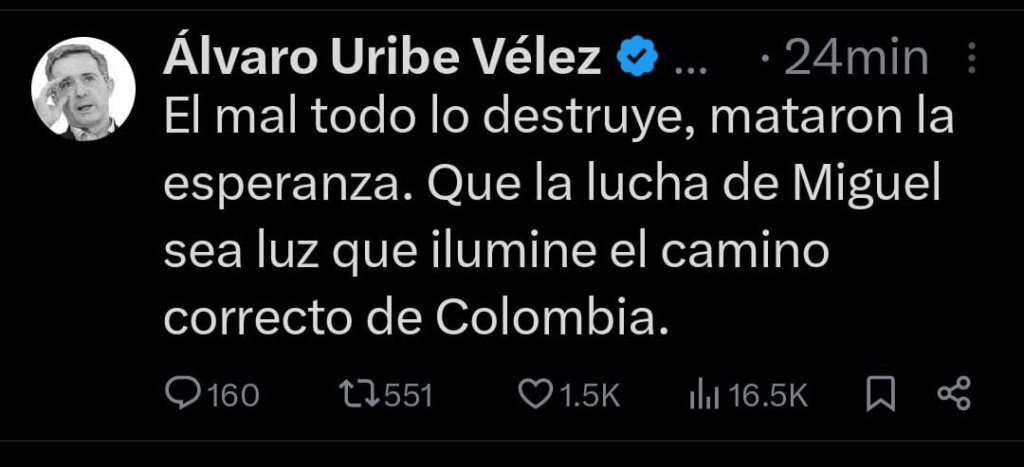 • El ex presidente Álvaro Uribe Vélez lamentó la pérdida de su copartidario y amigo, afirmando que "mataron la esperanza".