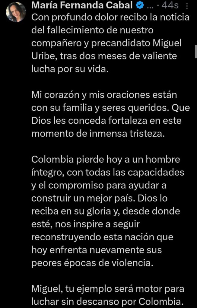 Uribe Turbay había sido atacado con arma de fuego, recibiendo varios disparos, dos de ellos en la cabeza, lo que lo mantuvo en estado crítico y con pronóstico reservado desde el momento del ataque. A pesar de las múltiples intervenciones quirúrgicas y los esfuerzos del equipo médico de la Fundación Santa Fe, el senador no logró recuperarse de las graves heridas. El último reporte médico, publicado el 9 de agosto, ya indicaba que el político se encontraba en estado crítico tras sufrir una hemorragia en el sistema nervioso central.