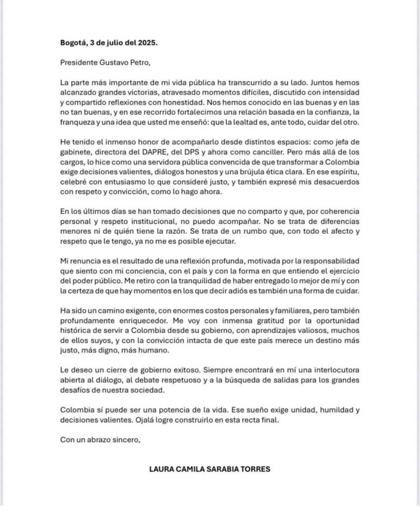 En un movimiento sorpresivo que sacude el panorama político nacional, Laura Sarabia, quien hasta hoy se desempeñaba como canciller y era considerada una de las figuras más influyentes y cercanas al presidente Gustavo Petro, ha hecho pública su renuncia al gobierno.